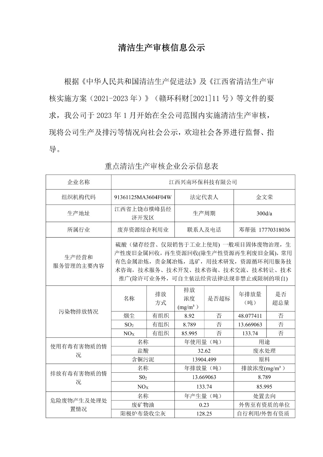 江西兴南环保科技有限公司清洁生产审核信息公示