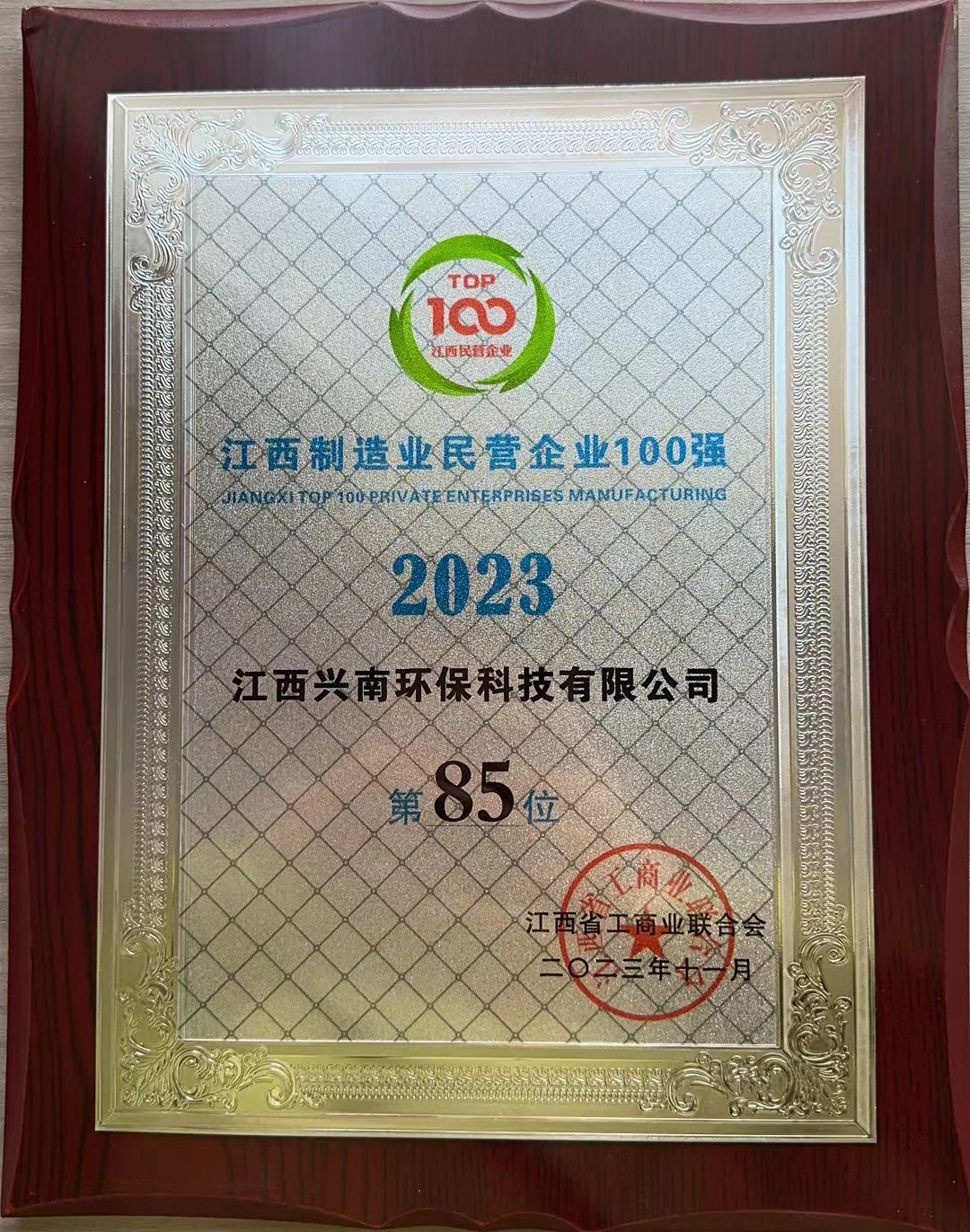 江西兴南荣获2023江西制造业民营企业100强第85位